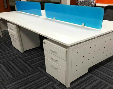 Details: This workstation having 25mm thickness of table top with 2mm edge banding mounting on 25/50 MS powder coated square pipe along with PVC race way and above the Table top Deco painted glass 4+4 sandwich coloured Glass is mounted ( with brackets without perforated sheet on at corners).